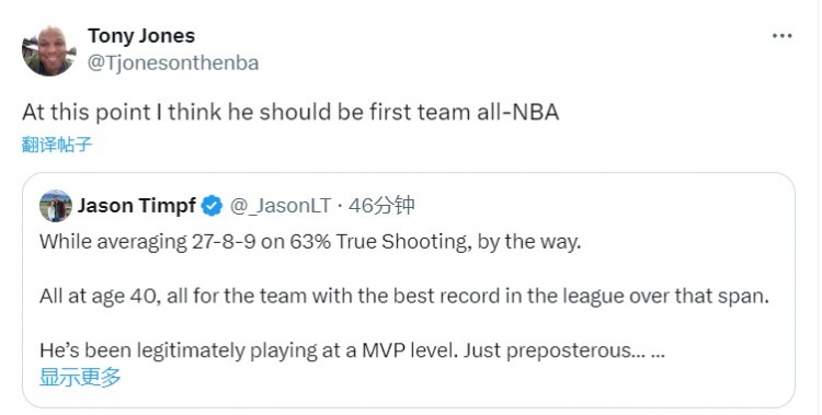 比赛结束后,TA记者Tony Jones在社媒上谈到了詹姆斯,他先是转发了一位媒体人的评论,在旁边写道:“目前我认为他应该是一阵成员。”