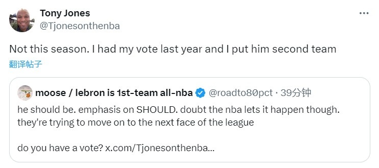 之后,被网友问到有没有投票权时,Tony Jones回复:“不是这个赛季。上赛季我有投票权,我把他列在二阵里面。”