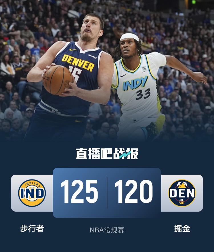 此役一上来双方迅速找到节奏,约基奇势不可挡单节狂揽21分,掘金中段开始发力拉开比分,首节结束时掘金领先9分,次节回来,哈利伯顿手风不顺专注串联,特纳和托平内外开花,但掘金稳扎稳打及时回应,半场战罢,掘金依然领先5分。易边再战后哈利伯顿得到本场首分,托平和特纳连中三分率队后来居上,三节结束后步行者反超1分,末节决战,步行者延续火力始终占优,决胜时刻约基奇和威少传接球失误,哈利伯顿两罚中一后掘金追分未果,最终步行者125-120力克对手。