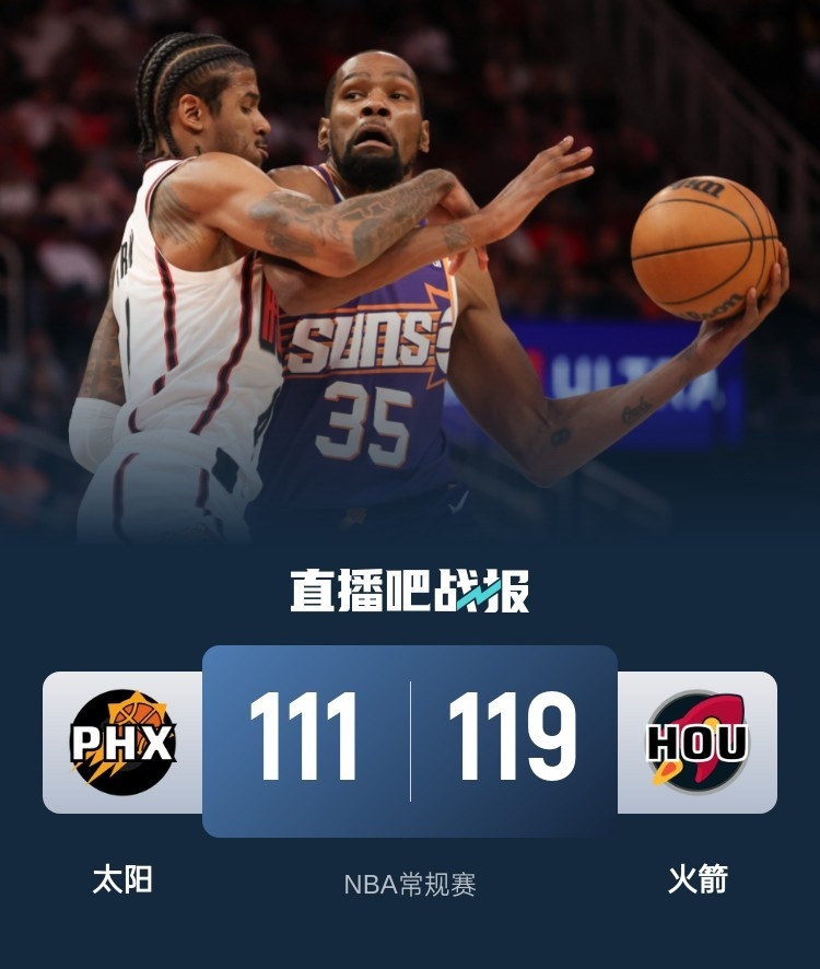 开场后两队就打得十分激烈,奥尼尔外线连中三记三分帮助太阳取得领先,杰伦-格林带队追分,伊森和狄龙防守端多次抢断打出反击,火箭一度将比分反超,第一节结束前太阳连得6分夺回领先。第二节两队上来两队陷入拉锯战,火箭率先打出攻势,但随后他们进攻断电,太阳在半场结束前又是连续拿分以6分优势结束上半场。下半场回来两队重拾手感,杜兰特带领太阳先是一波攻势将分差拉大到两位数,随后火箭依靠反击和冲抢前场篮板又将比分追上。最后一节火箭的反击依旧打得风生水起又将比分反超,波尔用扣篮和三分为太阳稳住阵脚,但随后火箭再度掀起攻势将比分拉开,杜兰特独木难支,最终火箭119-111逆转送给太阳3连败。