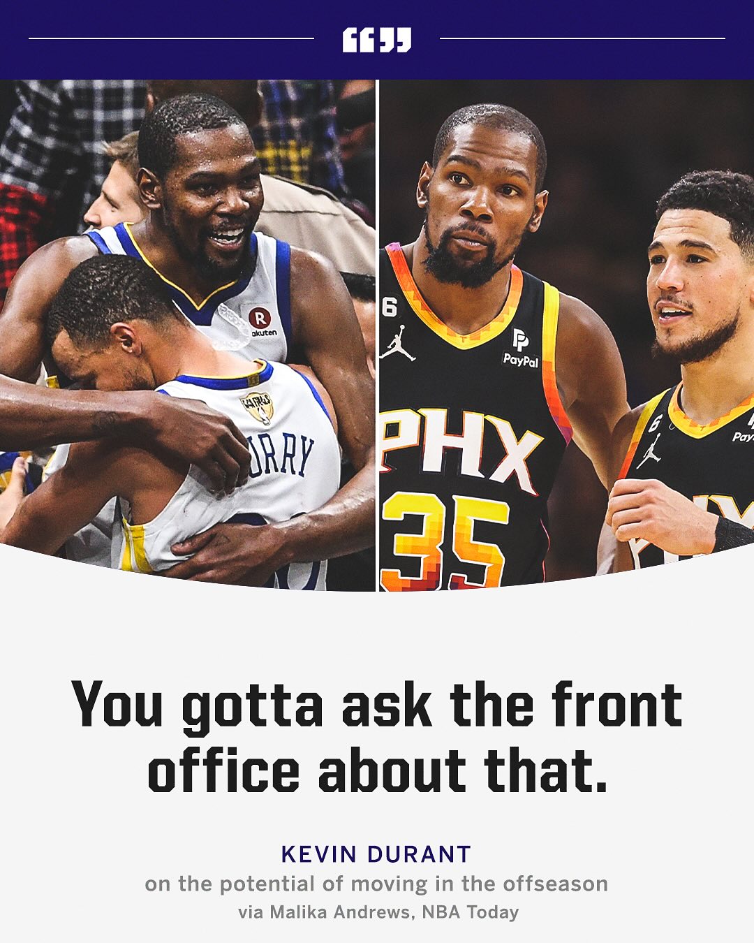 记者问到了杜兰特夏天可能的去向,杜兰特回答:“这你得去问管理层怎么想了。我之前没有要走的计划,我此前也没有提出交易申请。当然,当你为一支球队花了这么多钱,但是球员们去没有达到应有的期望,可能有些人就是得走了。所以你可能需要通过剩余的赛季看看管理层压力如何,看看他们对这个球队有什么想法。我的目标就是每一天都奉献最好的自己,我会高度关注下一步会如何。”