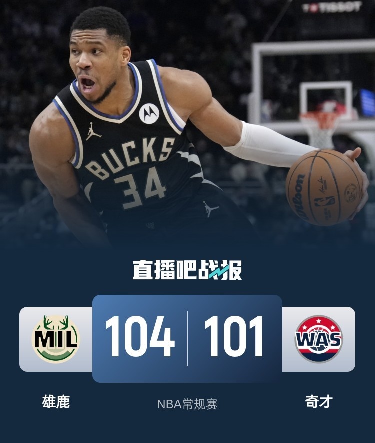 比赛开始,奇才率先发力,连中三分取得两位数领先,雄鹿多点开花努力追赶,库兹马得分助攻一肩挑,字母哥不断冲击内线,但奇才稳扎稳打保持优势,半场战罢雄鹿50-56落后奇才。易边再战,奇才命中率骤降,雄鹿内外开花单节净胜15分强势反超,末节奇才打出14-1追到只差1分,关键时刻大洛佩斯连续罚球命中,米德尔顿绝平三分不中,雄鹿104-101奇才惊险过关。