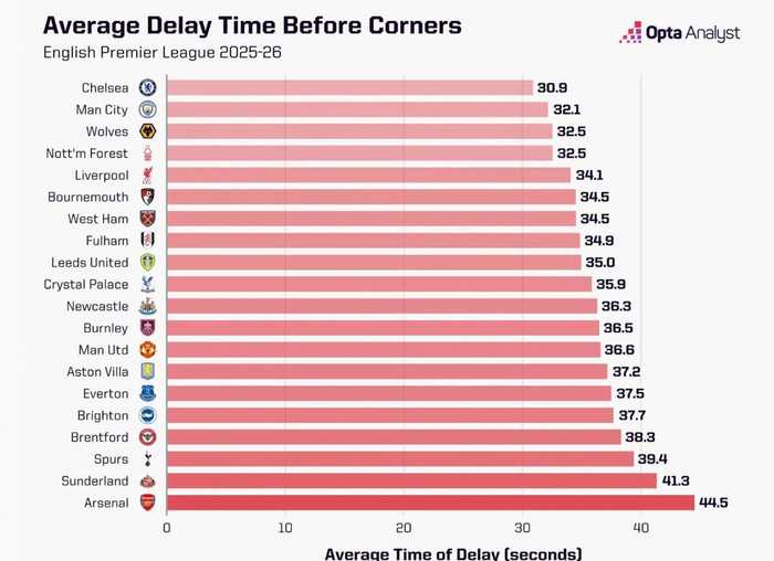 阿森纳角球处理耗时44.5秒居英超榜首 发布时间:2026-03-07 13:51:40 | 来源:雨燕直播网 Opta Analyst公布了2025-26赛季英超各队在角球开出前的平均拖延时间。数据显示,阿森纳以44.5秒高居榜首,是本赛季英超目前角球处理最慢的球队。 上一篇: 多家媒体:姆巴佩今日回马德里再进行检查,对曼城出战成疑 下一篇: 亚马尔14球追平92年西甲U19进球纪录