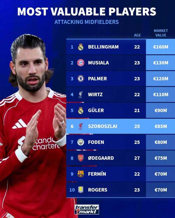 德国转会市场盘点当今足坛进攻型中场的身价,排名前十的球员如下: