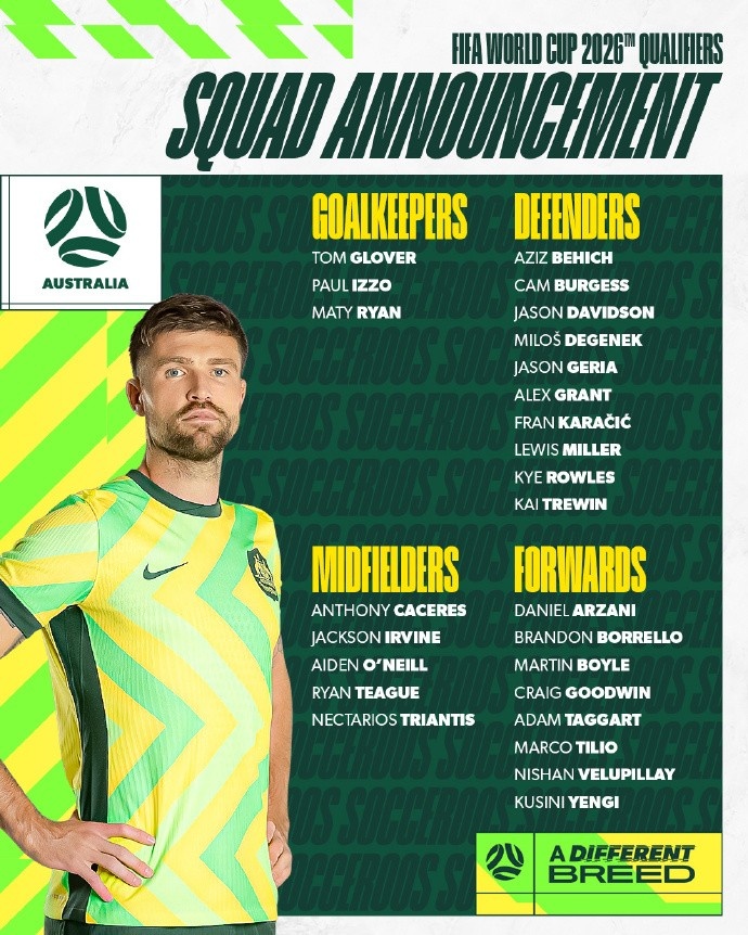 与去年11月的大名单相比,澳大利亚队更换了12名球员,主因就是严重的伤病潮。至少有5名波波维奇时代的18强赛的主力缺席,包括后卫齐卡蒂、苏塔,中场博斯、麦克格林和前锋杜克。波波维奇征召了4名从未入选过国家队的新人以及两位2022年后再未入选的“半新人”填坑。