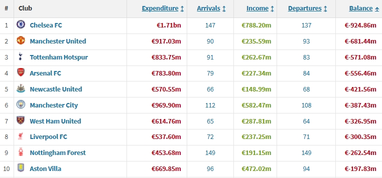 德转指出,英超BIG6在过去五个赛季里都面临巨大的转会费赤字,切尔西在净支出排名中居首,其次是曼联、热刺和阿森纳和曼城,最为“节俭”的俱乐部则是利物浦。