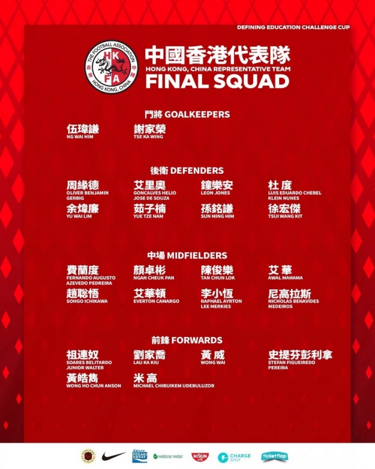 5月24日讯 本月30日,曼联将在位于中国香港的香港大球场,与中国香港代表队进行热身。今日中国香港队公布了本场比赛的大名单,其中周缘德、茹子楠、孙铭谦、徐宏杰、李小恒、黄皓隽6名效力于中超联赛的球员在列。