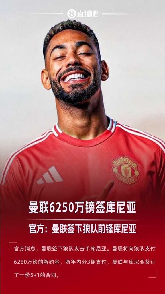 据媒体报道,曼联将向狼队支付6250万镑(约合7414万欧元)的解约金,两年内分3期支付,曼联与库尼亚签订了一份5+1的合同。