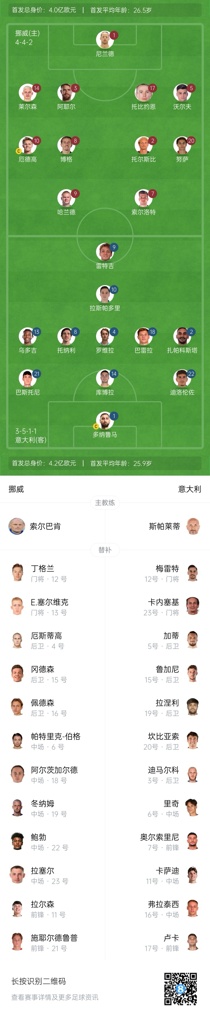 06月07日讯 世预赛欧洲区小组赛I组第3轮,挪威对阵意大利,赛前首发公布。
