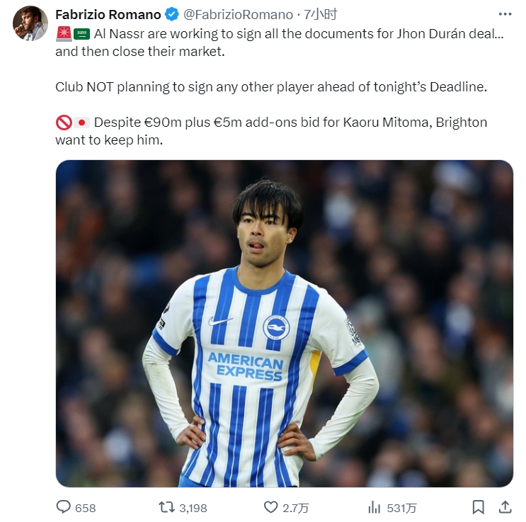 2月1日讯 记者罗马诺此前报道,利雅得胜利9000万欧+500万欧浮动报价三笘薰,但被布莱顿拒绝。罗马诺强调了布莱顿希望留下他。这条推文热度超高,并且评论里几乎所有球迷都不理解布莱顿的操作。
